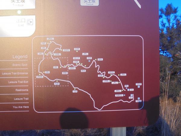 接上成熟小路后,左转沿云瀑沟西侧山脊向北上山,该段小路目前已被云瀑沟景区初步开发,虽未铺设石阶蹬道,但在断崖处已设有简易铁梯供行人攀越,且部分位点有崭新的导览地图指路。从导览图中,可知云瀑沟西脊上有“二土埃”、“头土埃”等地名,或为当地村民对土城子组砂砾岩风化形成的紫红色砂土的独特称谓。走友在拂晓晨风中快速行进,至7:39,日出南山,火光迸裂,短暂的金色世界以后,再度睁开双眼,群山上下,已是一片青蓝。