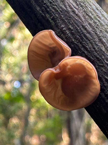 4号早上8点多,我们从小路进入丹霞山,乔木高耸,树林阴翳,很有热带雨林的感觉。无意间发现一棵小树上长着数片大小不一的木耳,摸着厚实柔软,煞为可爱。在武哥的惊呼声中,我忍不住全部撸了下来,珍宝般藏在了口袋里——孰料第二日便捂成了干巴巴黑乎乎的模样,此为后话。翻入景区后,一路依旧无人。在爱情谷、卧龙冈、翔龙湖路口见到路牌,才明晰了方向。卧龙冈有群白衣女子在练功,我们右转往翔龙湖方向。路上游客逐渐多起来。我们大概途经了阴元石——只是流苏和我全然不知,然后攀长老峰,从别院禅寺一侧下山。禅寺后有一棵很奇特的树,粗壮的树干,数处被锯断,直冲天穹的是一枝罗汉松,旁逸斜出的是一枝榕树。路牌的介绍此即绞杀树——若非人为干预,罗汉松许是连这一小枝都保不住了!