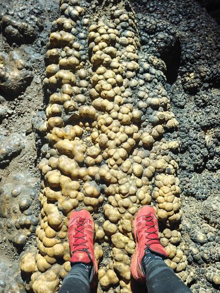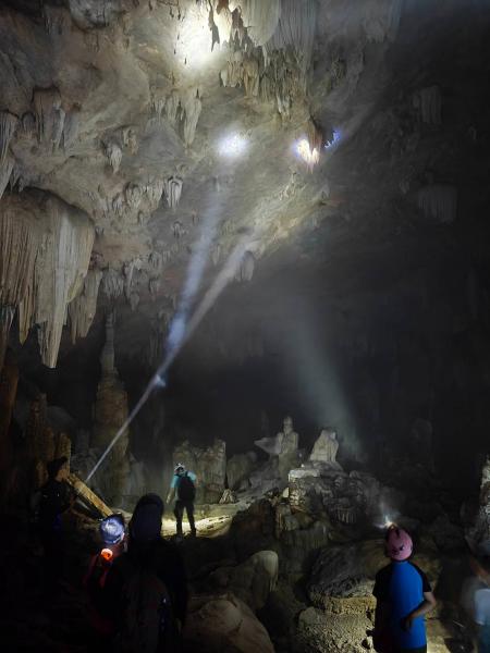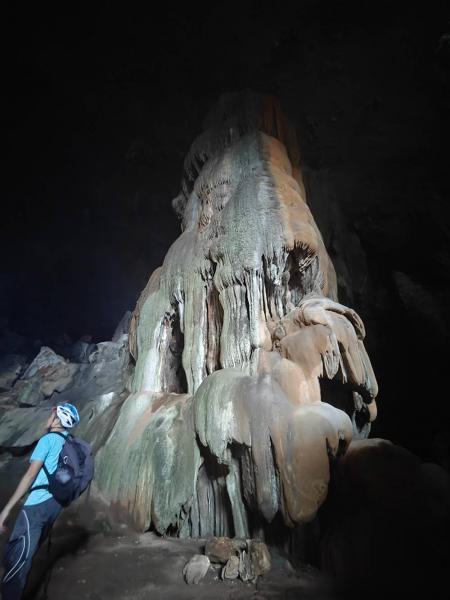 洞里面伸手不见五指,需要靠头灯的光亮照亮前路。这种更加近距离的触感比一些景区溶洞五颜六色的灯光要质朴很多。可以用手去摸不同年龄的钟乳石,稚嫩的钟乳石和更年长的钟乳石颜色不同,质地也很不一样。这些都是时光的直接见证。
