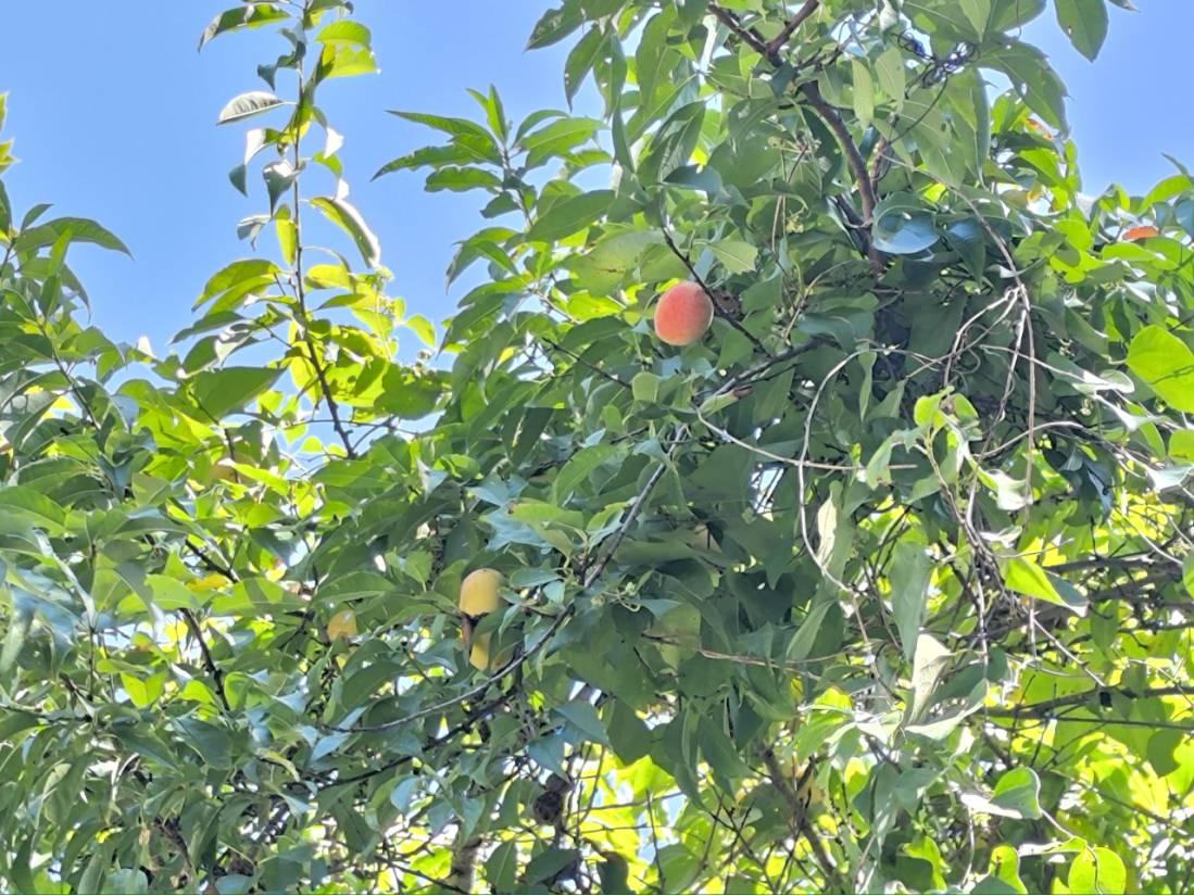 9点半在青竹学校集合完毕,沿公路往明月山方向前进。自在鱼和梅在前面带路,两人彷佛多年老友重逢,有说不完的话,时时传来欢声笑语,YM默默跟在后面。今天万里无云,视野极好,又是第一次来明月山,到处充满了新鲜感,我就走在最后面到处看看拍拍。才走了1-2km,一猛男骑电动车追上自在鱼,走到跟前才知道是大佬水牛专门从长沙赶来,他们三个边走边聊,叽里咕噜我也听不懂,大致意思是要跟我们一起徒步。走到XT50终点站附近看到一棵桃子树,低处的桃子已经被人摘光了,本着有枣没枣先搂一竿子的原则,我爬到树上一顿猛摇,每人都吃到了几个。桃子已熟透,酸甜可口。路上有几座桥,都是80、90年代的水泥桥,就没兴趣观察记录了。