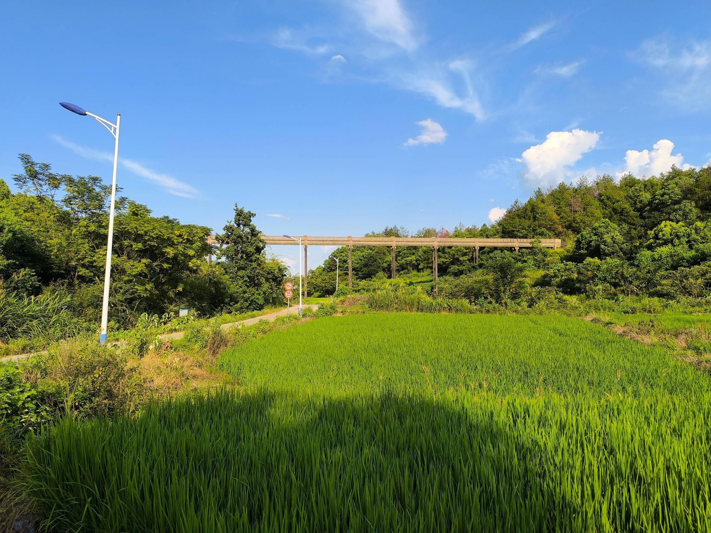 沿机耕道下行,这时太阳已晒不到,突然来了兴致,跑了一段。最后一段走错了路沿着山坡直冲下来,刚好从渡槽下经过,看着高高的渡槽感慨万千。