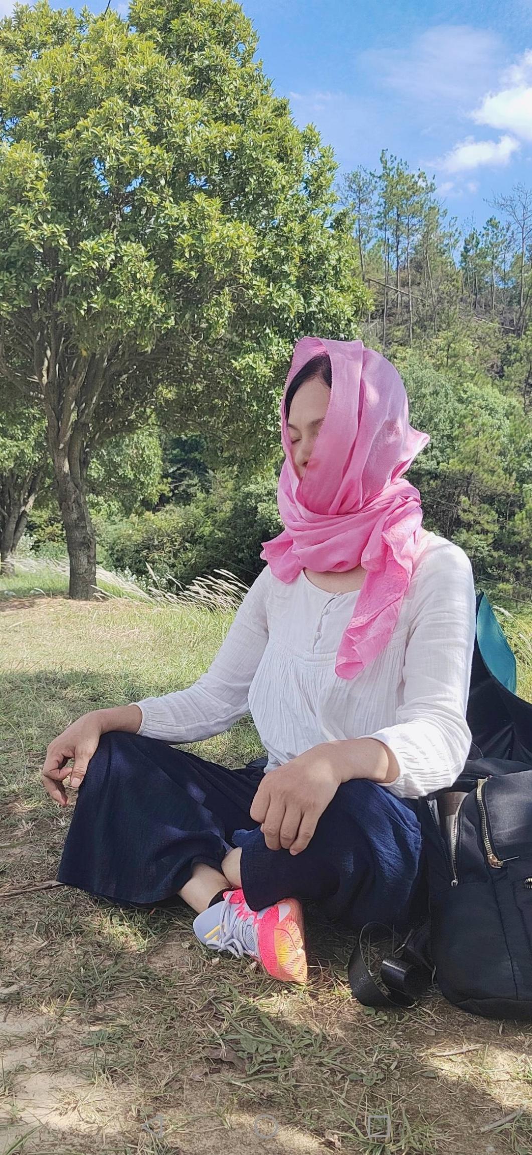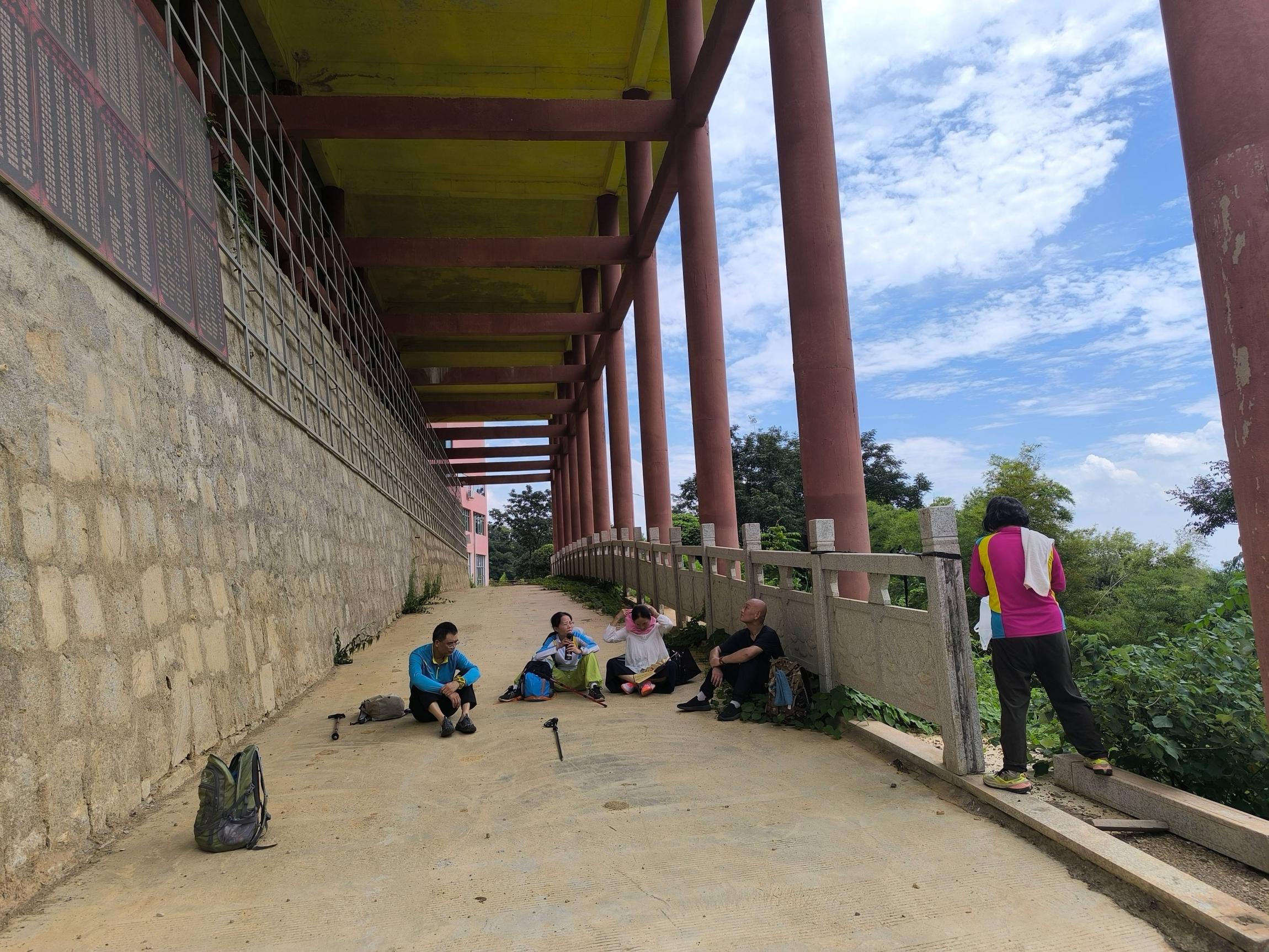 继续上坡到山顶,水泥大道呈现,曾经在这里路餐,铺地饮酒热闹在眼前。今天没有停留,即便刚好12点,我们加快脚步,下行上山,朝青松寺拉锯式前行。到山顶左拐下行,路边漂亮的酸枣躺在地上,捡不捡?要坐下来等后面的三人,那就捡呗!不耽误时间,几分钟就是一小袋,干净漂亮,待到青松寺门口,继续捡。寺门口酸枣树高大,果更漂亮。进门上台阶,听到狗踹气,一只黑狗趴在地上,寺尼一句“阿弥陀佛,上香拜佛吗?”微微一笑“阿弥陀佛”,一只橘猫来到香炉下,柠檬挂着绿果开着白花,透过佛堂纱窗门,里面安静清凉,不忍心满身灰尘步入,只想着要是进去静坐一会一定美哉。补水进食,分三层三个地方休息,中间层回看,“到达彼岸”,一百六十年银杏桂花树下品广东鲜桂圆,下层集合再休息。