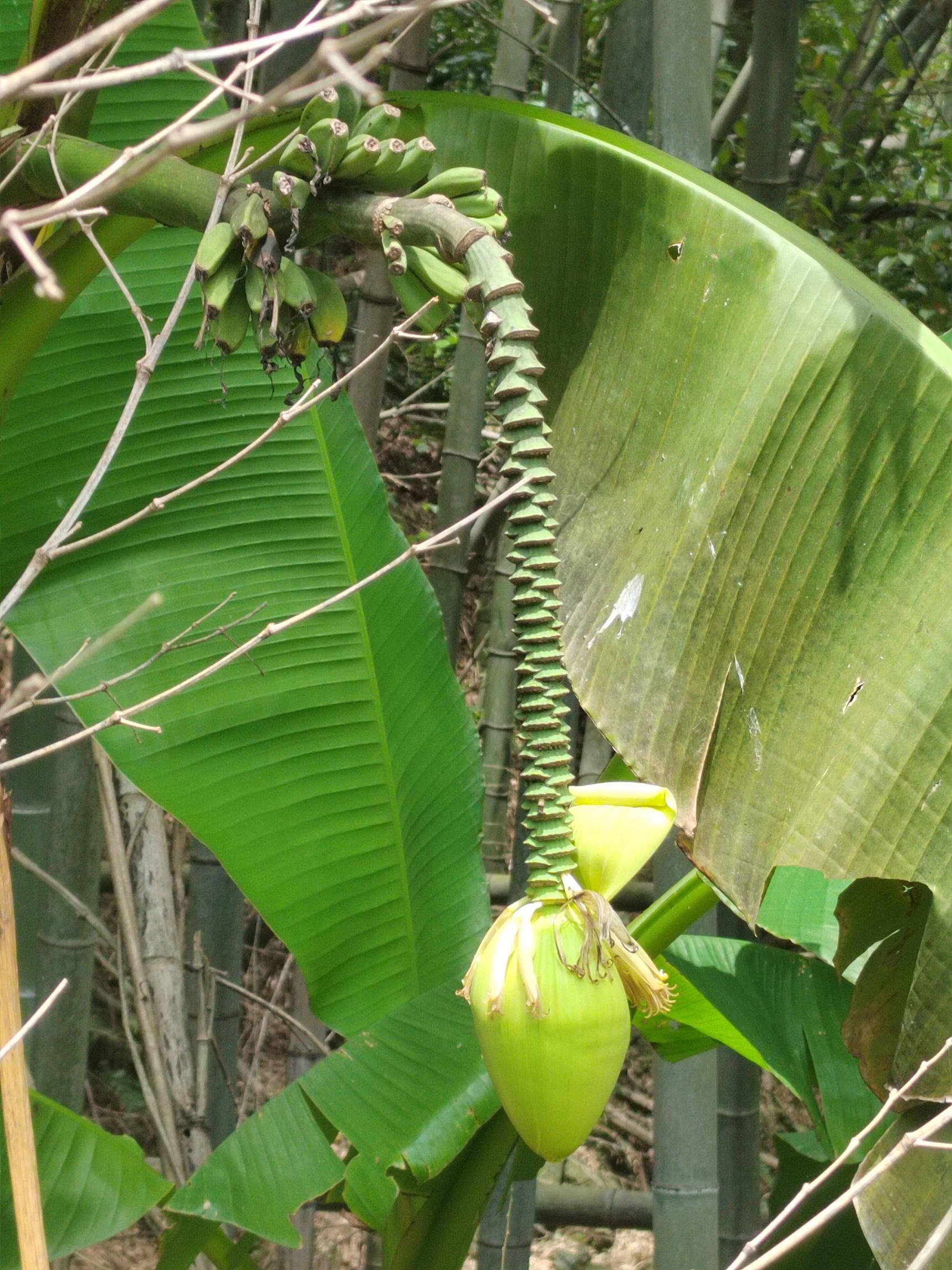 小溪中间两孔丁家桥,清代道光五年古建筑,合体尖面大蜈蚣,似龙似蛇水中游。蜈蚣避水,庇佑桥体平安。踏步桥上,观荒芜之地,想古人智慧,蛇怕蜈蚣,蛟龙似蛇,为避免蛟龙兴风作浪,而用大蜈蚣来护桥,曾经这里应该是气派热闹的地方。今日只有青山绿谷,一车一人一群黑山羊。路边农户都搬出山谷,留下房屋残存痕迹。一上坡路边,芭蕉开花结果,小小的芭蕉未成熟。