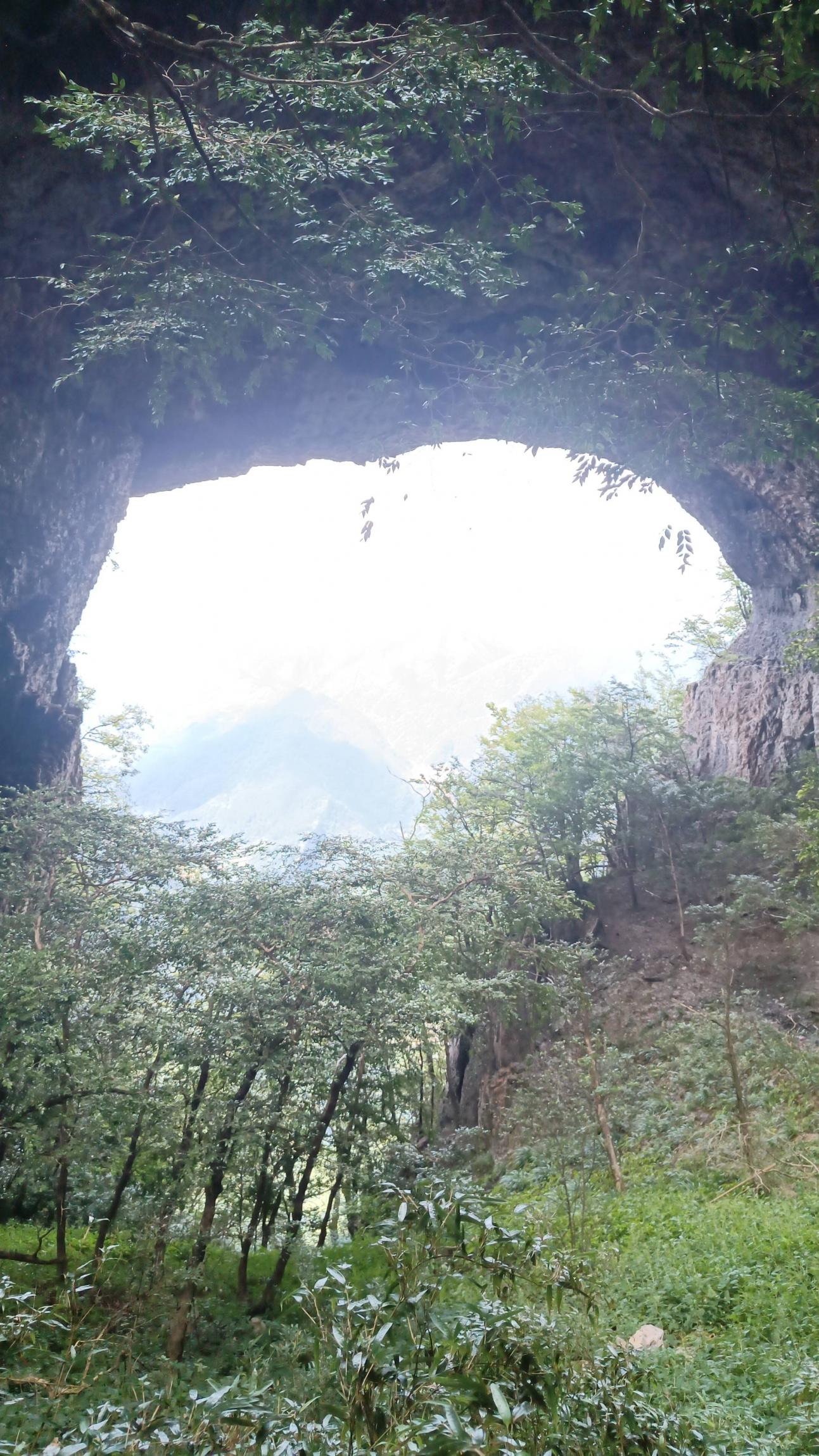 来到双生洞和天生桥,真乃大自然鬼斧神工,外面看一个洞,里面看二个洞,天生桥,大约10米长,宽1米多,比较薄,上面生长6棵树,好像随时可以跨掉。
