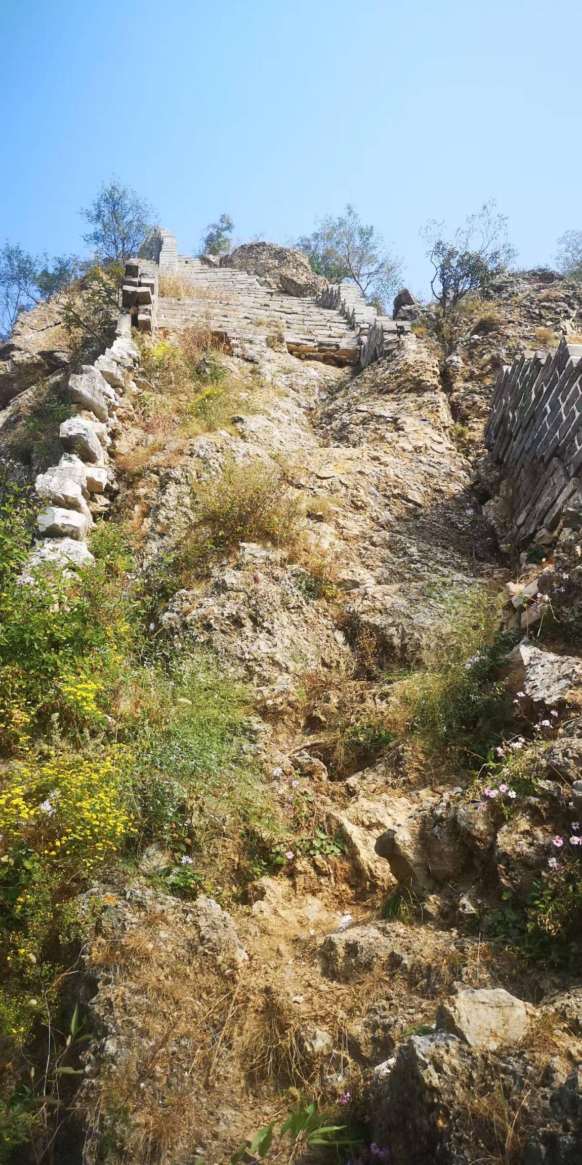 但是城墙下降的困难完全超乎我的记忆,说实话我记忆里都没有下降的过程,完全被忽略掉了。遇到第一个陡峭的贴墙壁下降,我整理好背包,小心地倒退着从窄窄的墙砖上挨下来,惊魂未定,就是一个接一个的陡峭下降,直到一大段砖墙下裸露的80度岩壁,我开始怀疑十几年前是不是真从这里下去过。这看上去就是一座10米高的攀岩墙,如果走过这里,我应该绝对不会忘的。所以我怀疑是这些年的风雨侵蚀,这一段墙砖全部脱落了。