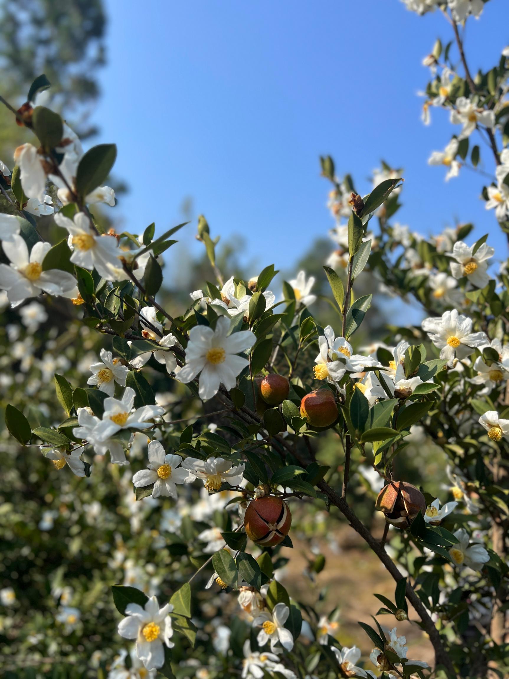 高洁茶海铺就清浅白浪,橙黄橘果缀满枝头,花的雅洁与果的甜润相拥,清风过处,漫溢着清芬与果香,满是自然的灵秀与丰盈。