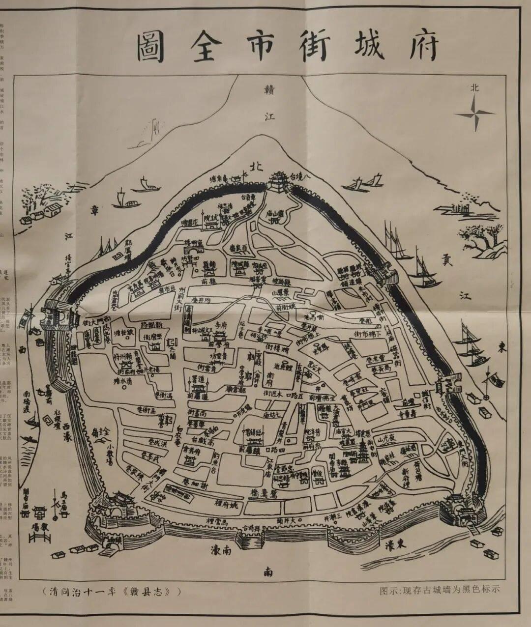 摊开清同治11年<赣县志>中描绘的赣州城市区,很容易寻找到今日南门口的位置。南濠沟引来滔滔贡水,宽阔的教场毗邻着关帝庙、马王庙,古城独有的吊桥横跨濠沟,中间一座高大的城门雄踞于古城墙上,另一座城门则在山底下与繁华的城区联贯着,这万夫莫开的雄关就是昔日的赣州镇南门。