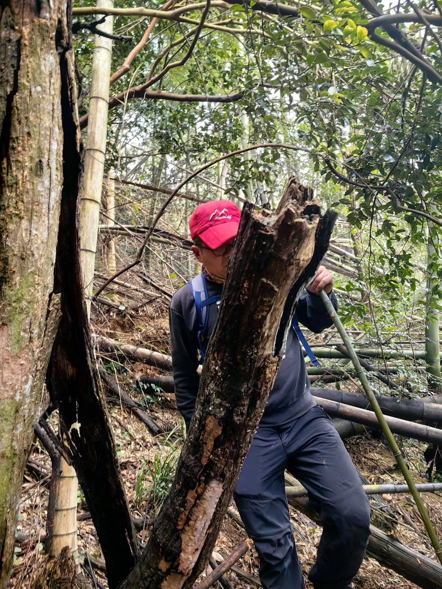 山脊的旧防火道突然断了,往前探路一段,难行,放弃,返回,来到新防火道,它带着我们来到一块大石头边就没了,而我知道,这是当年我们走过的小路上的一个景点。