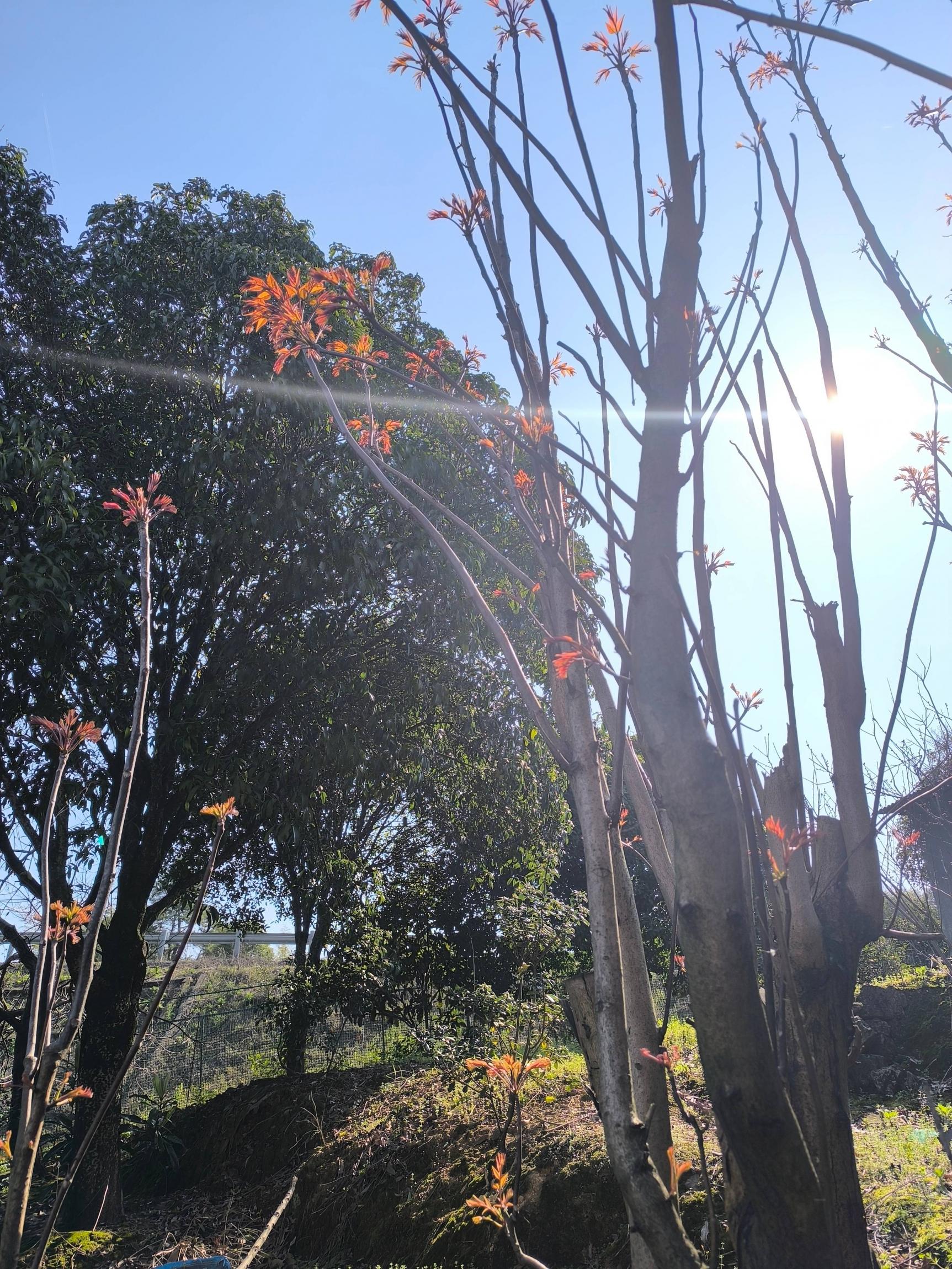 行至砖田村一带,远远望见一树嫩芽缀满枝头,紫红的芽叶鲜嫩欲滴,凑近一闻,正是香椿,此时不摘更待何时。
