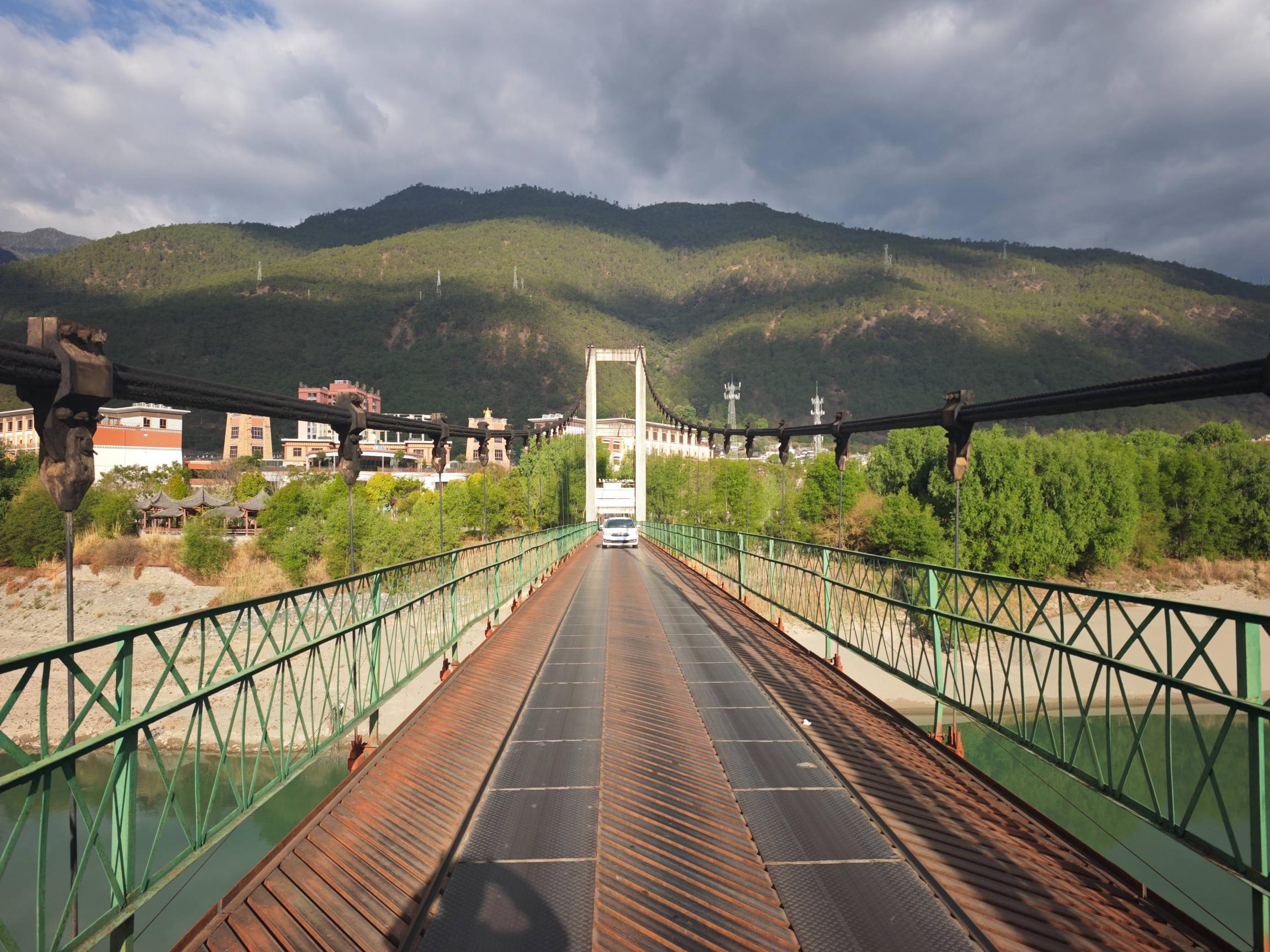 我的手机坚持到了酒店前台,此前居然还回光返照般支持我拍了离住处最近202路的站牌,以及通往开发区的那座铁索桥,它的宽度和承重只能容一车通过,且限高,因为承受不了卡车的重量。桥下就是平静的金沙江,江水浅蓝色,江滩由纯白的细沙形成。