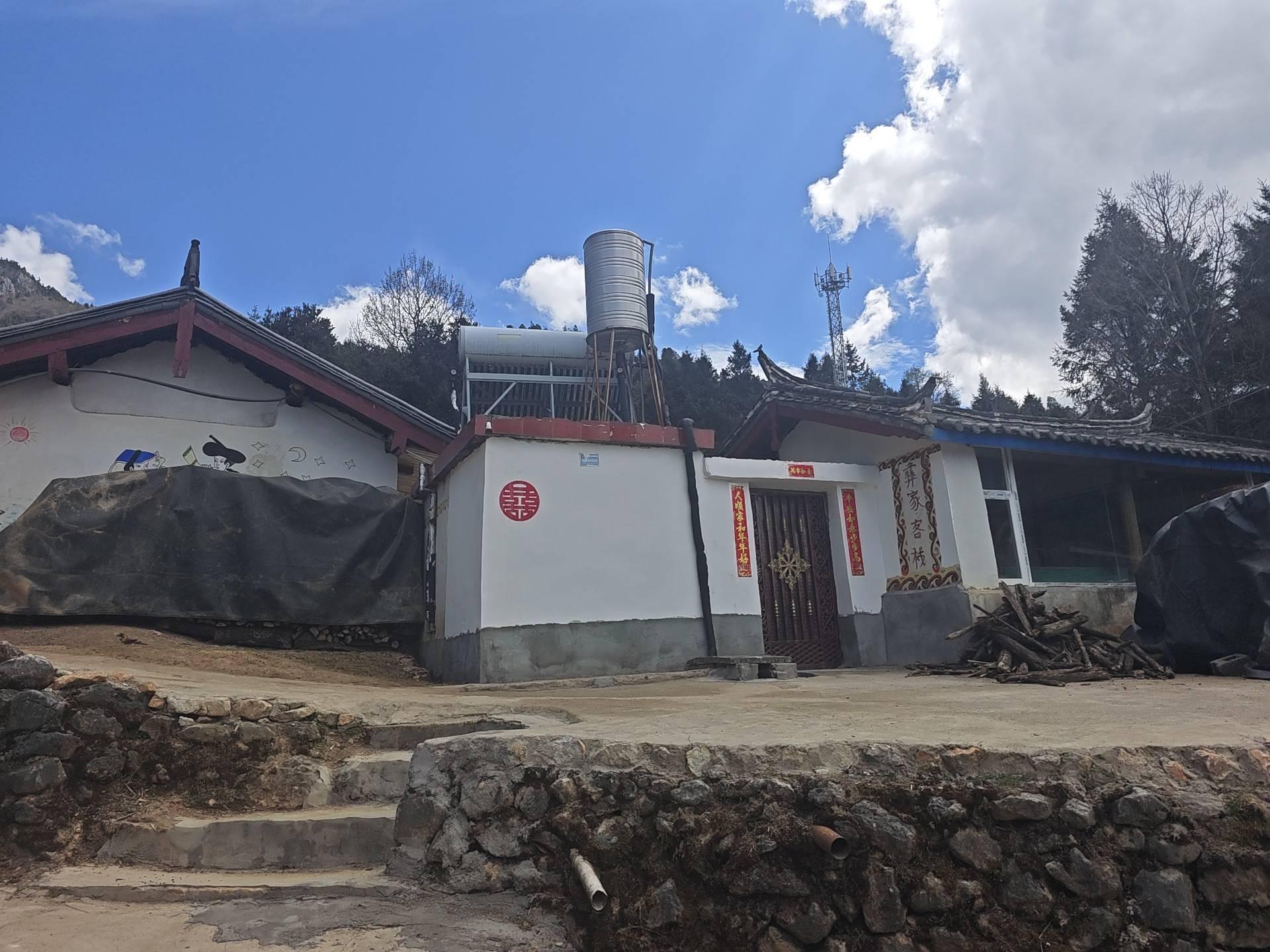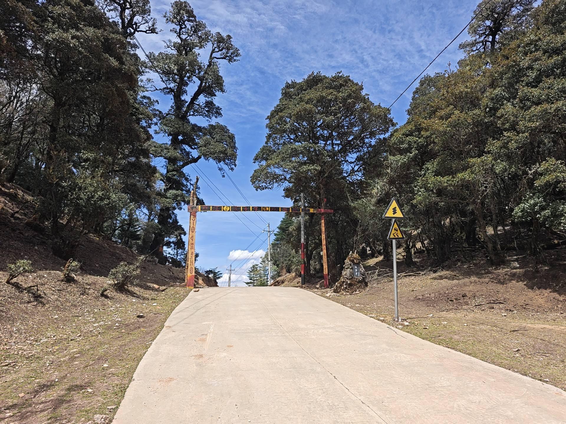 我迎着垭口上树立的”牌坊”向北走去,上面用汉彝两种文字写着”丽江波多罗欢迎您”。