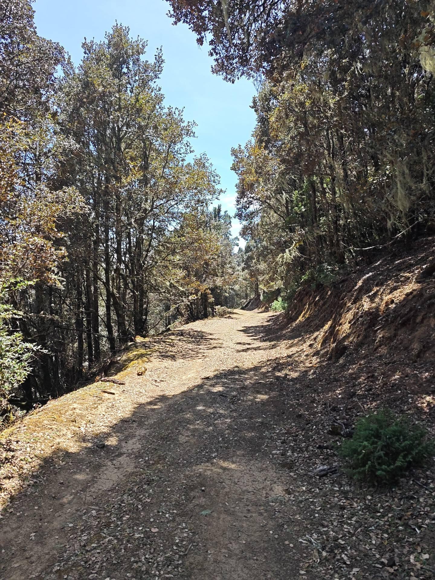 终于,小路把我引到了一条宽阔的防火道,在那个丁字路口,摆在我面前的是一条平坦的大路,看不出来那个方向高哪个方向低,我赌了向左,我想应该很快就能揭晓答案,如果是向上我就折返。运气不错,我赌对了,很快看见了下降的弯道,这条路比我上山的那条防火道年轻的多,边坡还是新鲜的裸露的,没有被植被覆盖,路面也有很多碎石,有点硌脚,但我的心情无比轻松,后面再没有悬念了,闷头赶路就好。