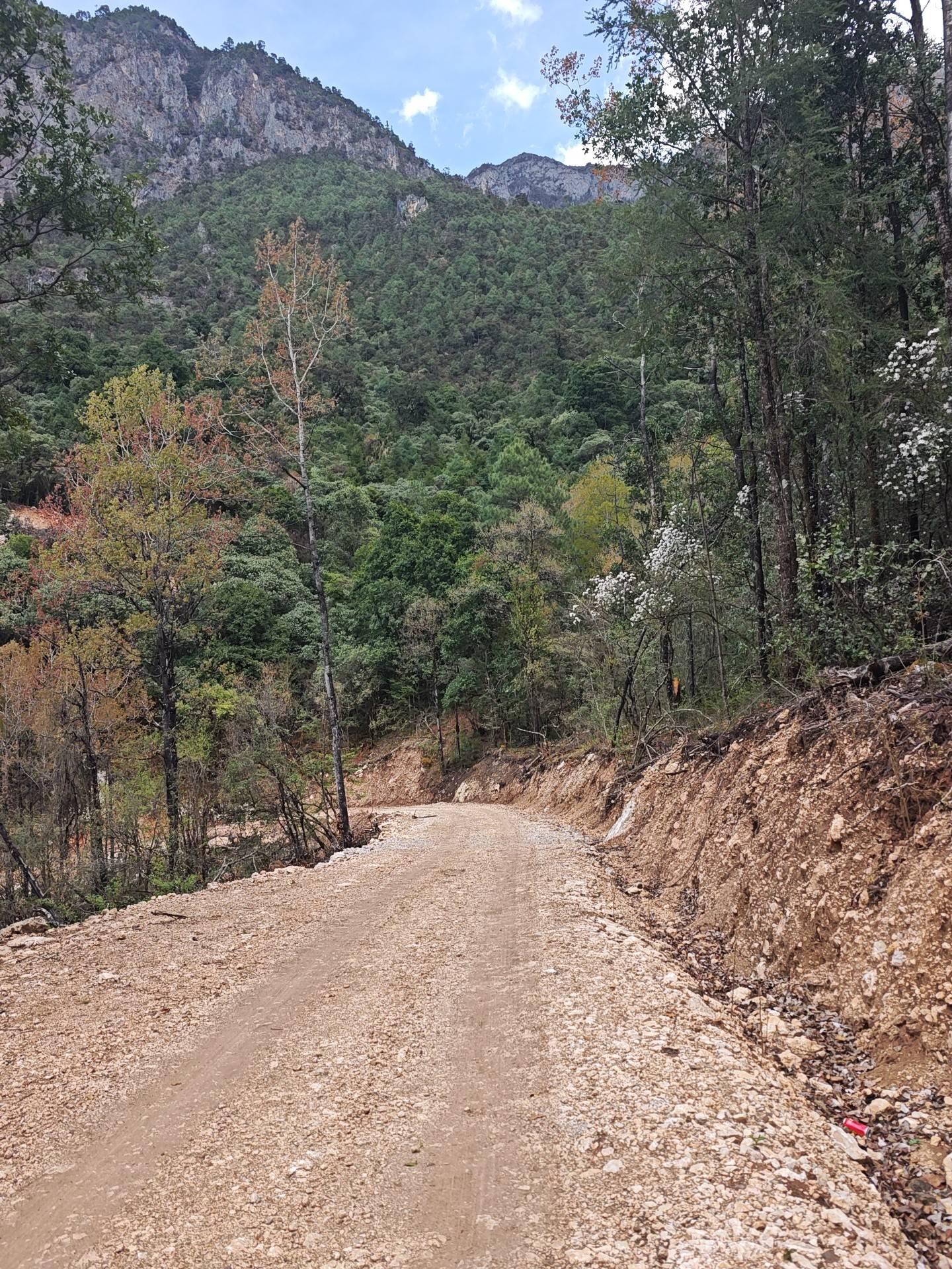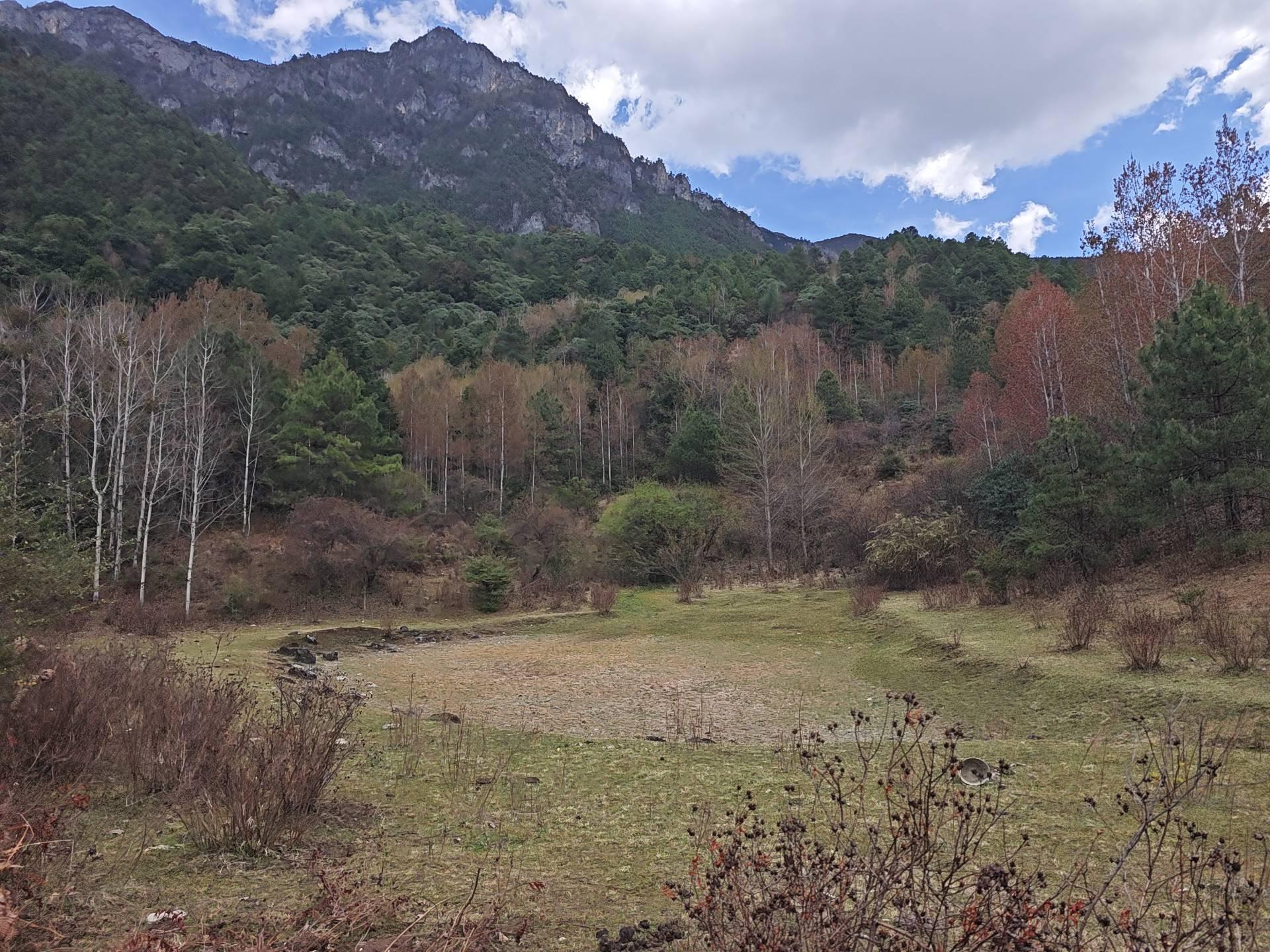 按照计划,我本该沿着水泥路向南前往南尧村,走一个闭环,但当我在垭口向北俯瞰,远远望见山坳里一个村庄,以及虽然看不见但可以脑补到的金沙江时,我改了主意,何妨来一次穿越?金沙江边的公路上,或许可以找车送我到32路起点站吧,即使回不去,不远处有香格里拉经济技术开发区,可以住酒店。总之不会露宿街头。