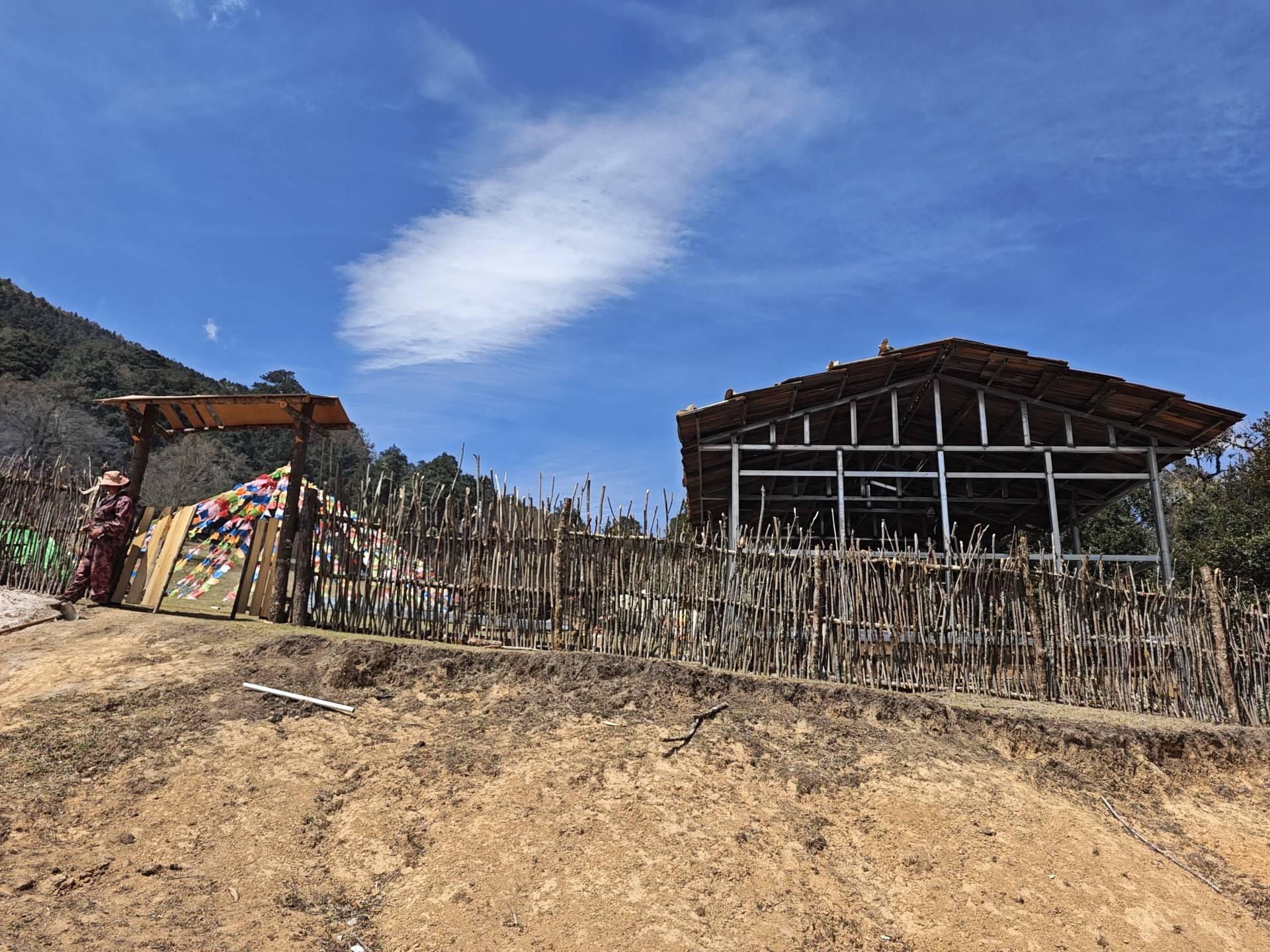 这条防火道快走到尽头时,我听到喧嚣的人声。前面停着若干辆车。一片空地上上,搭了一个硕大的凉棚,棚下面冒着烧烤的白烟,我似乎闻到了羊肉和孜然的味道。外围树着栅栏,几个木屋正在施工中。另一处草甸上,自带的天棚下,几个游客正围桌野餐。