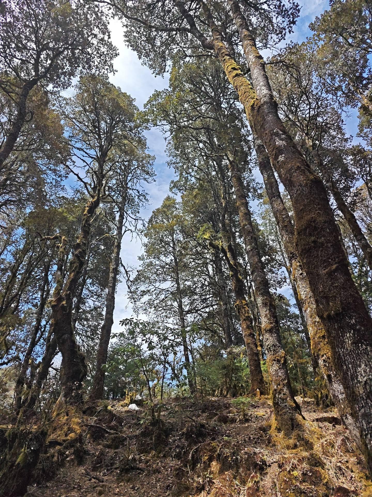 后面的路基本上完全忠实于规划路线,弯道多到让人产生一种一辈子都走不到头的幻觉,幸亏有《二的三次方》相伴,听刘宏伟如何用初中化学知识刁难一众学渣主播和一个正上高一的学渣观众。这一段12公里的路程,没有任何投机取巧的机会,没有发现任何一条捷径沟通不同高度的弯道,林木倒不是很密,高大的乔木间,空间还是很通透的,可能是海拔太高,热量不足,那些灌木和藤蔓不容易发展自己的种群,没有发展出小路,主要是走的人太少了,只有护林员偶尔光顾一下。走在这样宽阔的大路上,我根本没有机会碰到山蚂蟥。